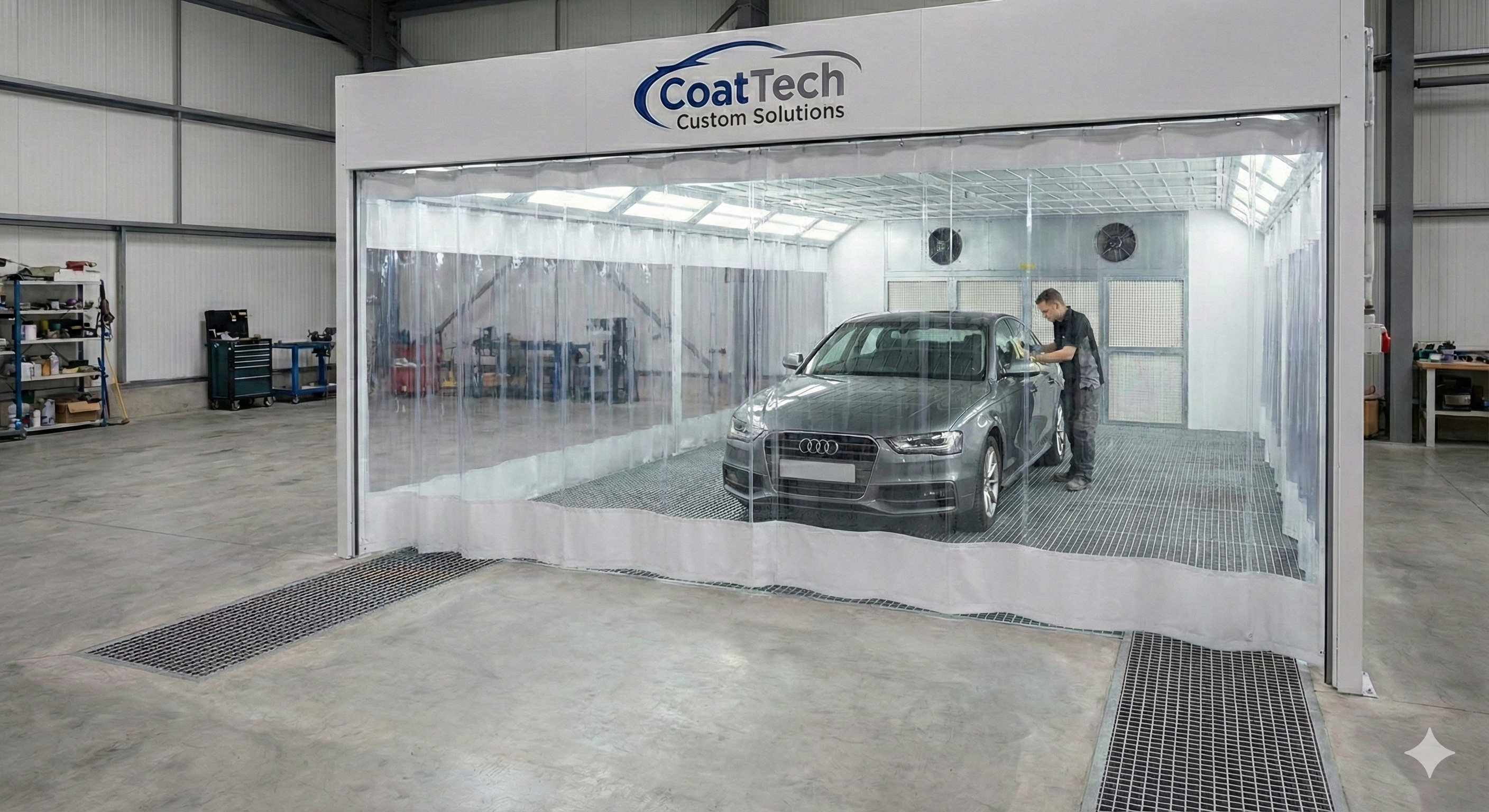 غلاف ستارة PVC على عكس الكابينة الثابتة، تستخدم محطة التحضير ستائر PVC منزلقة.